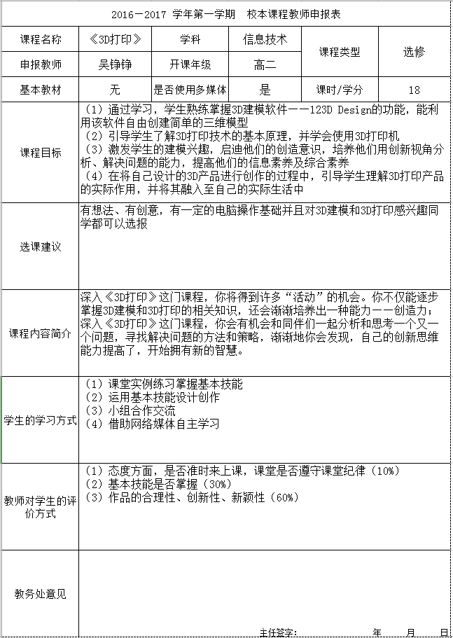 “3D打印”课程申报表