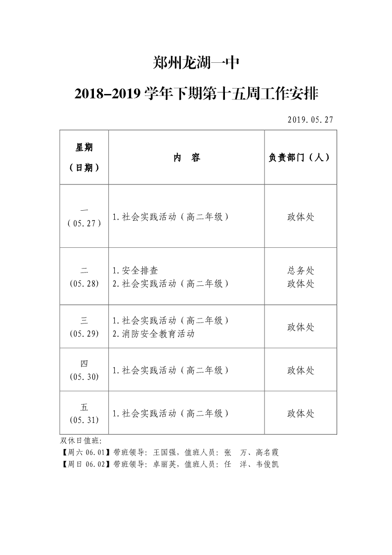 2018-2019学年下期第十五周工作安排
