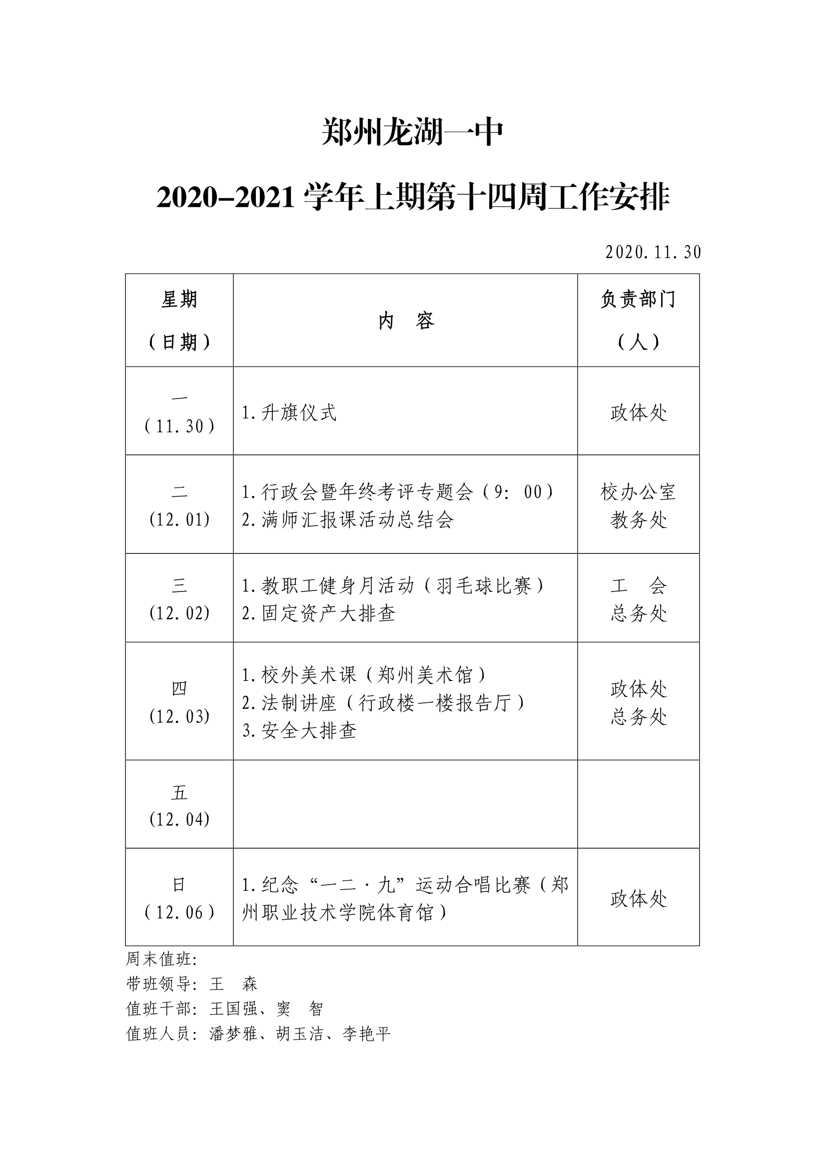 2020-2021学年上期第十四周工作安排