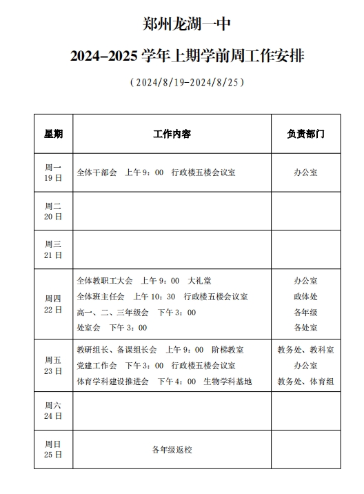 2024-2025学年上期第一周工作安排