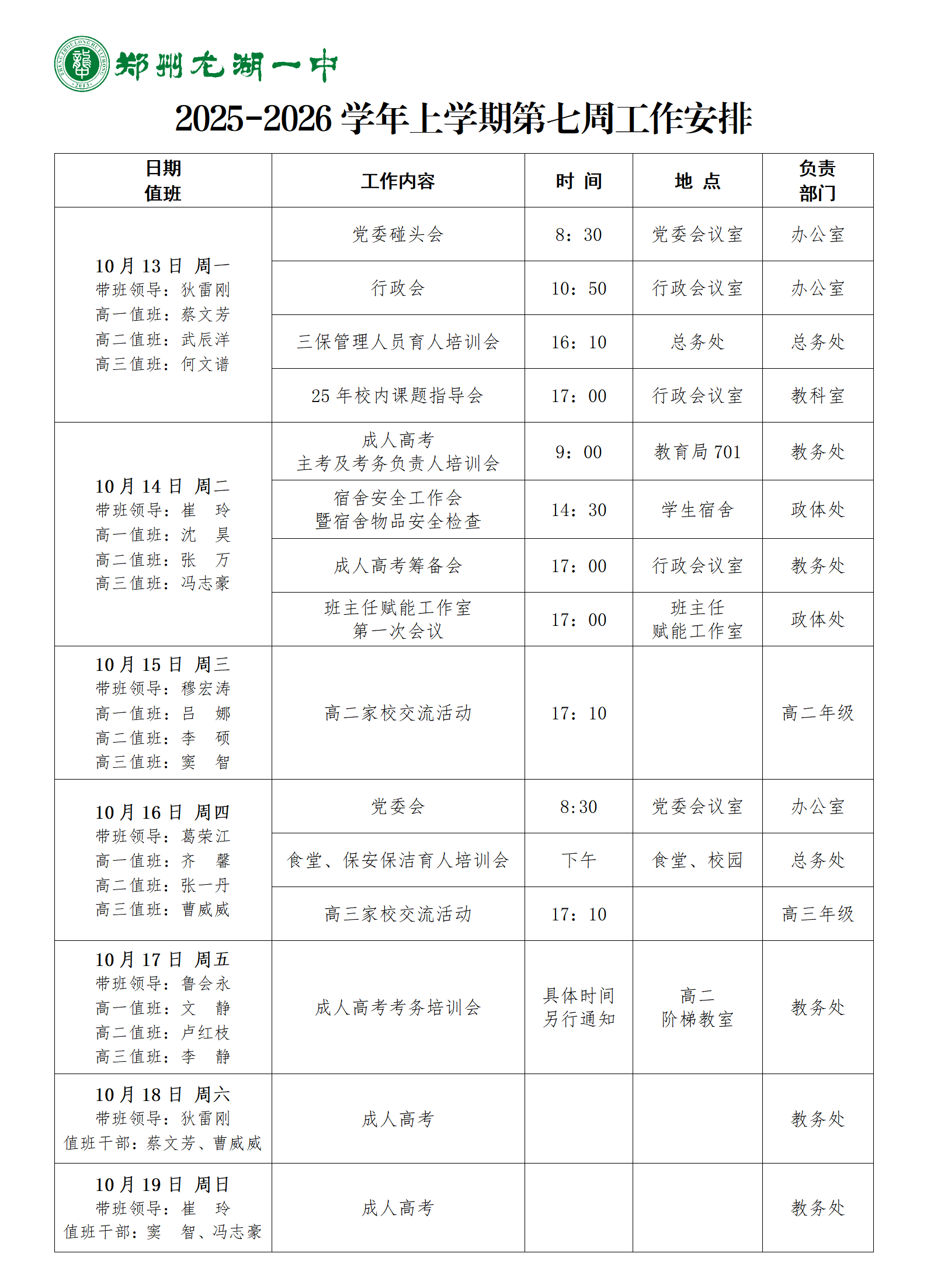 2024-2025学年下期第七周工作安排