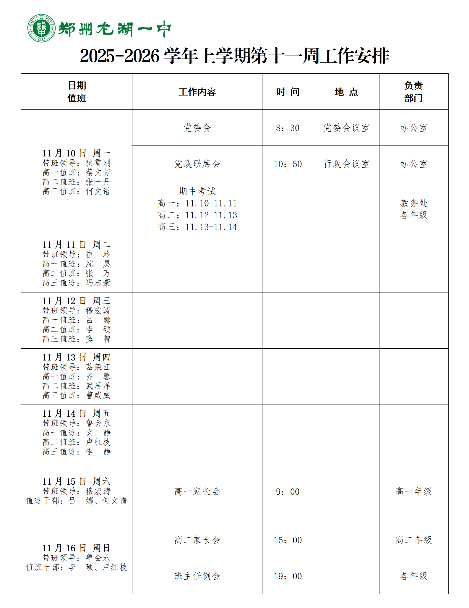 2024-2025学年下期第十一周工作安排