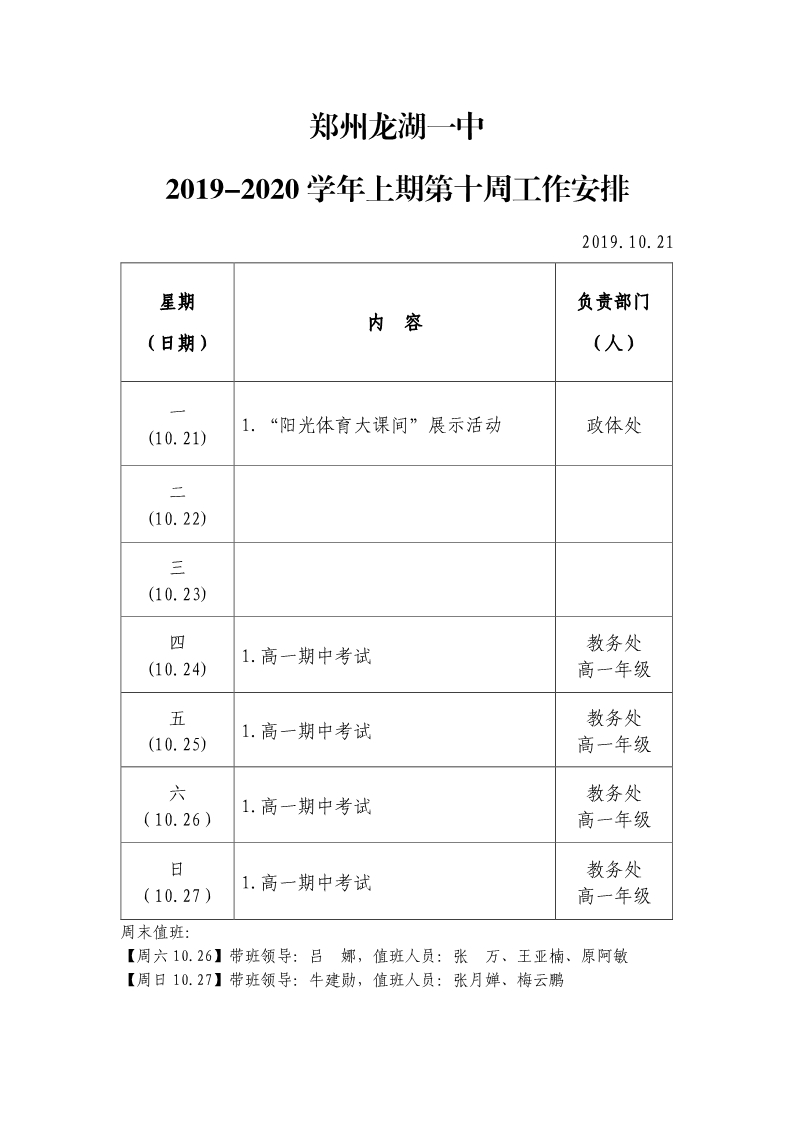 2019-2020学年上期第十周工作安排