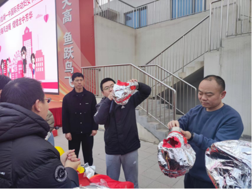 培训采取理论和实际相结合的方式开展。总务处主任窦智首先讲解防烟面罩的使用方法、材料特点、使用范围及注意事项,一边讲解一边示范,现场教师仔细聆听,认真学习,在场教师充分认识到防烟面罩的重要性,热情高涨,踊跃体验。然后,物业经理李靖向大家展示消防服的穿戴方法,教师代表刘慧杰积极参与学习穿戴。最后,窦主任向大家讲解消防水带的使用特点,物业经理向大家演示如何甩水带、如何连接接头、如何收水带,校领导和各位教师满怀热情参与学习,模拟演练,相互切磋。