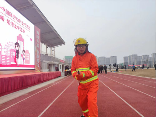 教师代表刘慧杰穿戴消防服、抛甩水带