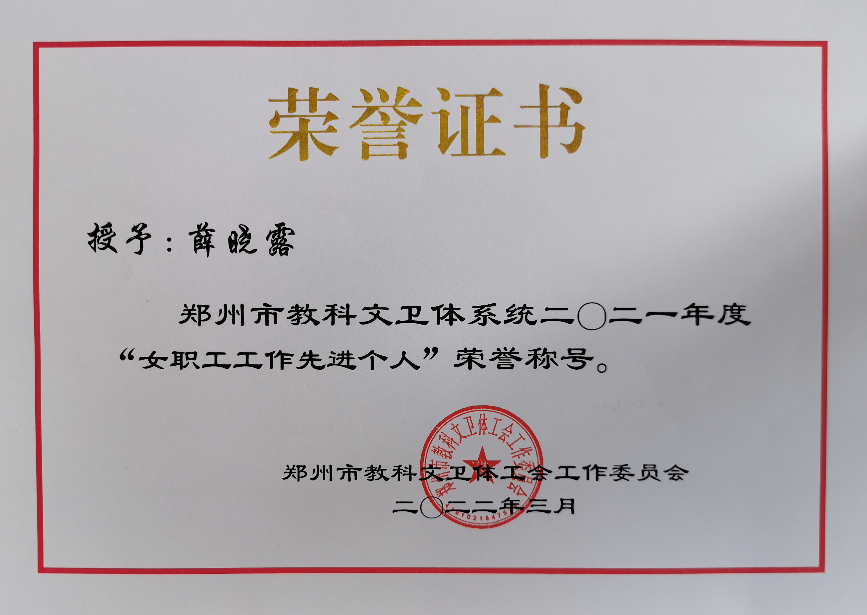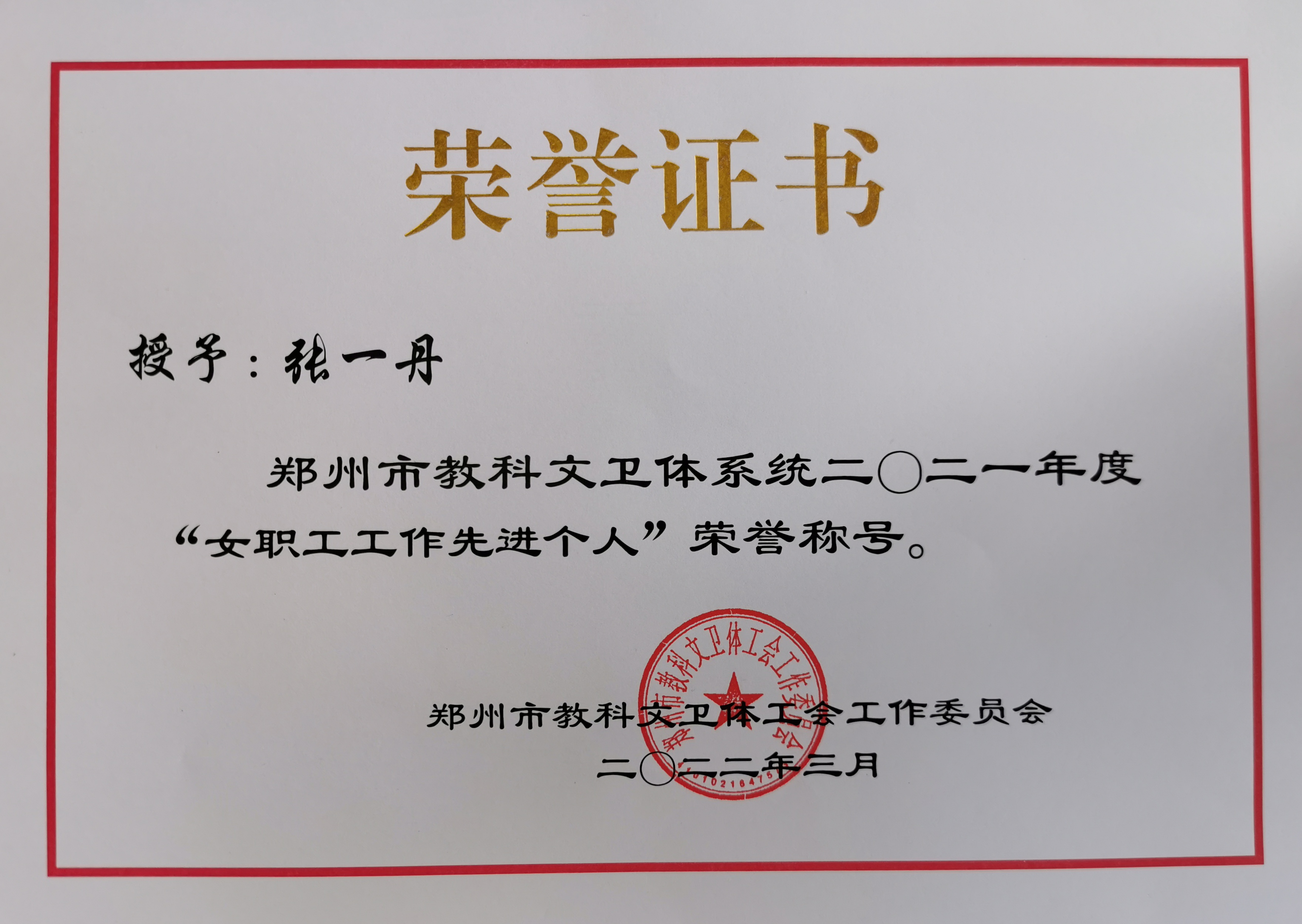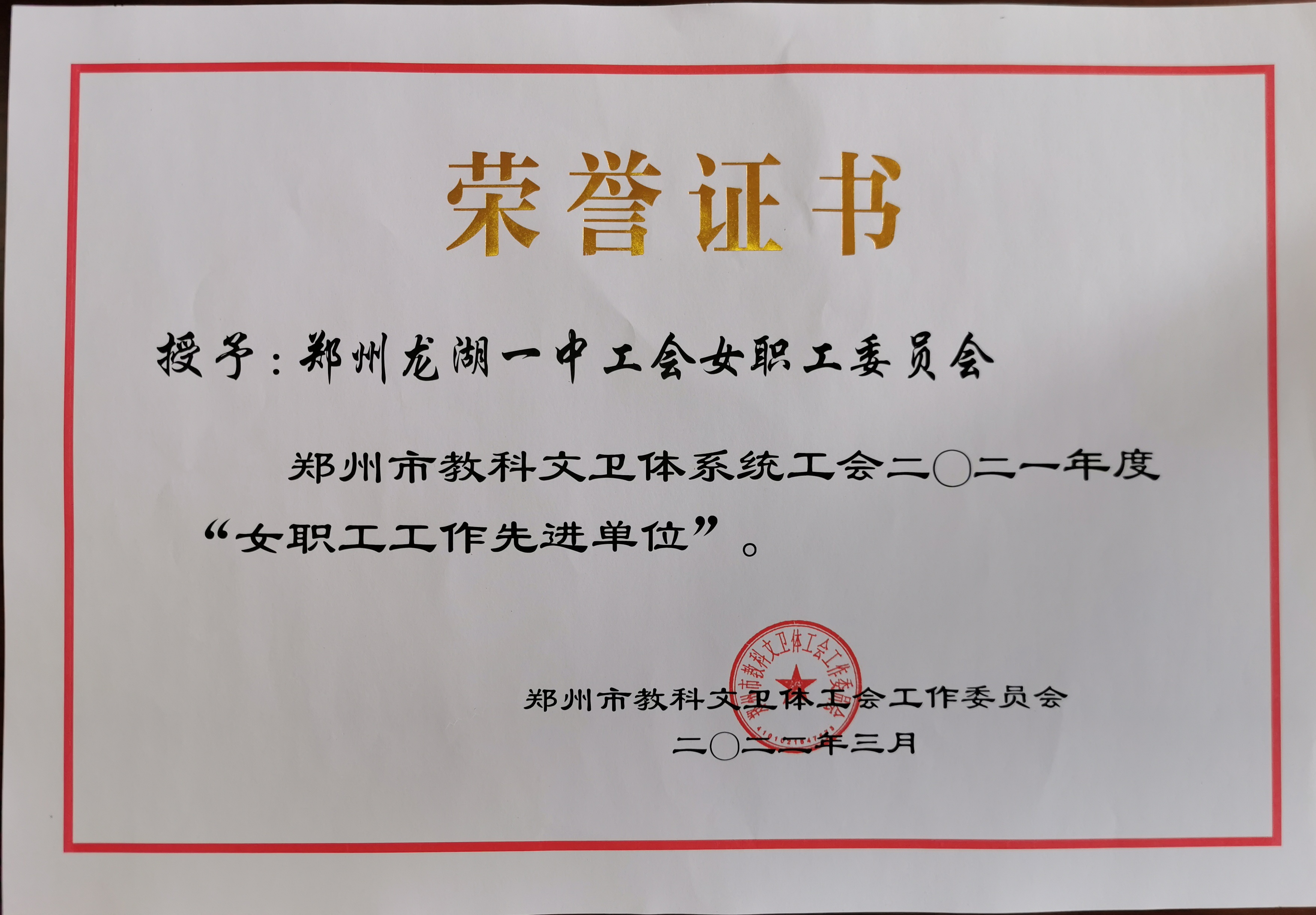 近期,在郑州市教科文卫体工会的评选中,郑州龙湖一中工会女职工委员会荣获二零二一年度“女职工工作先进单位”,我校张一丹、薛晓露荣获二零二一年度“女职工工作先进个人”荣誉称号。